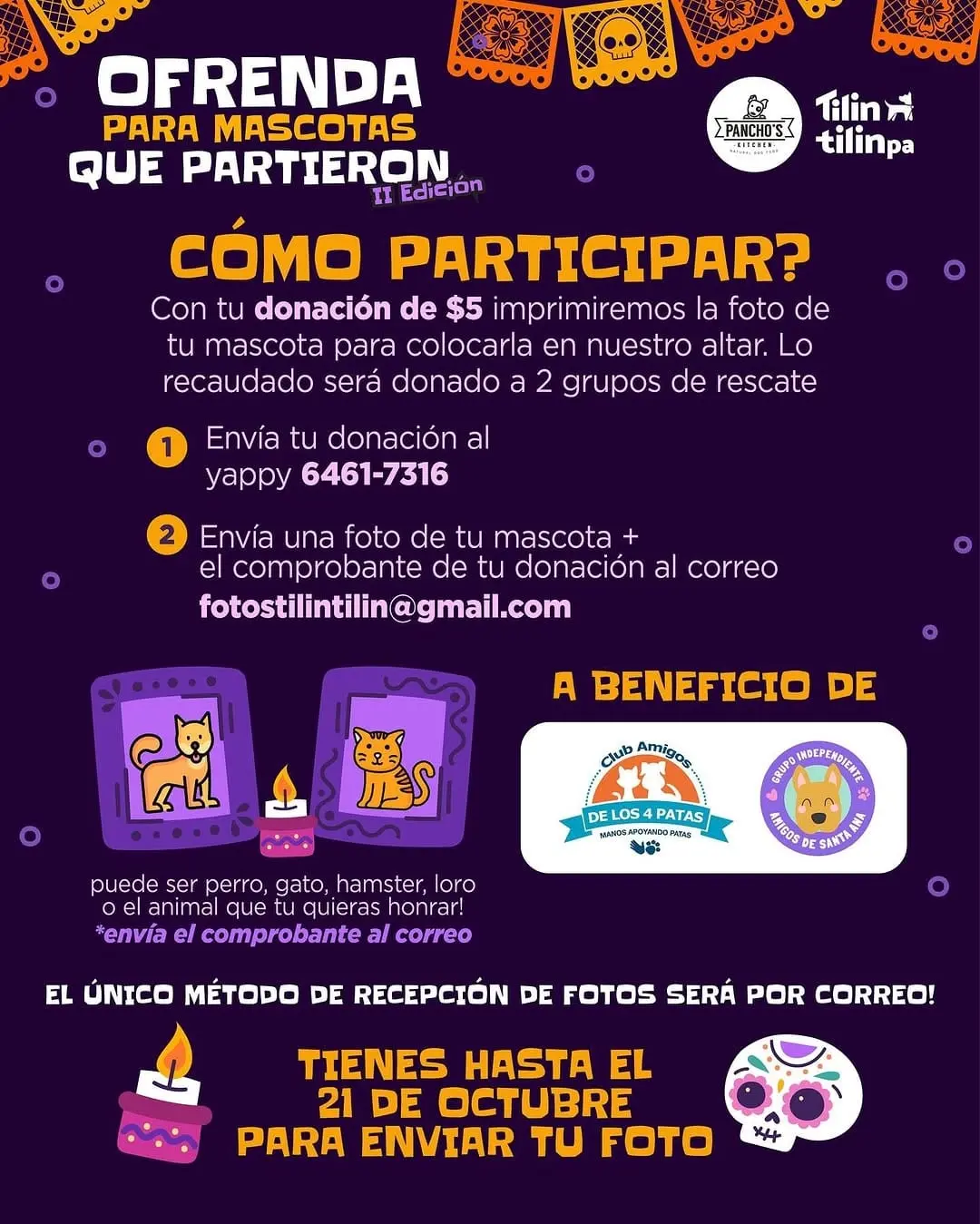 Por una donación simbólica de $5, los organizadores imprimirán la foto de tu mascota para colocarla en el altar conmemorativo. Cada imagen será una forma de decir “gracias” a esos compañeros fieles que nos enseñaron tanto amor y nos acompañaron en la vida.