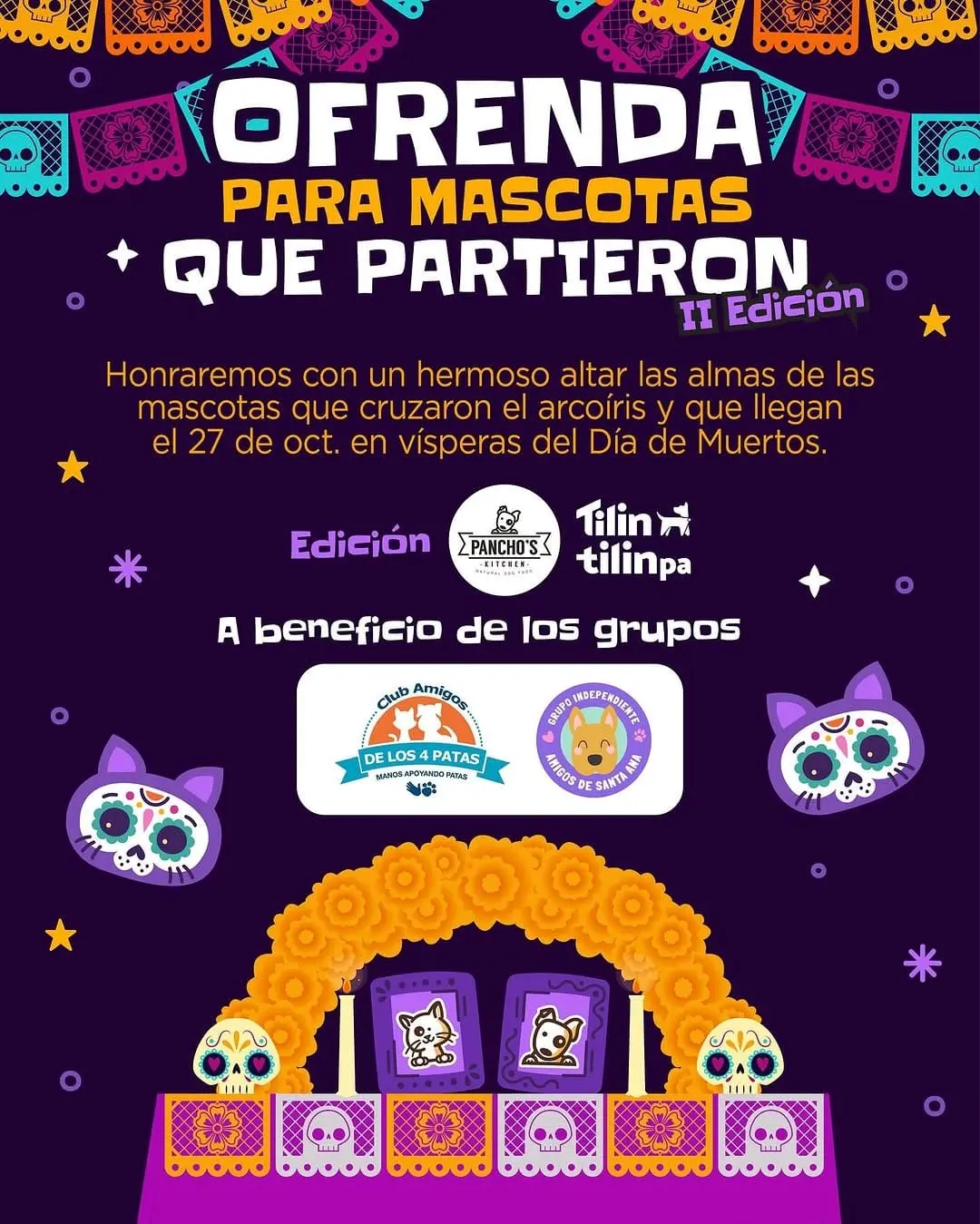 Este 27 de octubre, vísperas del Día de Muertos, se llevará a cabo la segunda edición de la Ofrenda para Mascotas que Partieron, organizada por Tilín Tilín Pa y Pancho’s Kitchen, con el propósito de honrar la vida de aquellos peluditos que dejaron una huella imborrable en nuestros corazones.